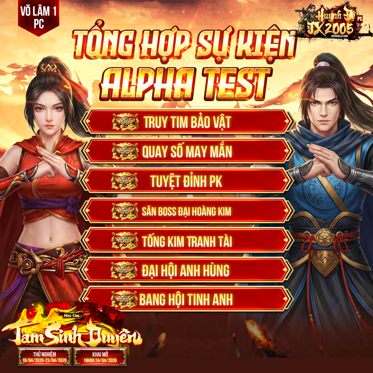 Mừng máy chủ mới Tam Sinh Duyên chính thức khai mở lúc 19h00 thứ 6, ngày 24.4.2026. BQT Huynh Đệ JX gửi đến quý nhân sĩ loạt chuỗi sự kiện dành cho cá nhân và Bang hội với nhiều phần thưởng cực hấp dẫn