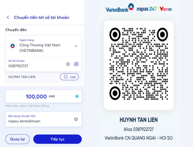 Hoặc có thể nạp chuyển khoản tự động theo cú pháp : napxu tentaikhoan ( như hình bên dưới)